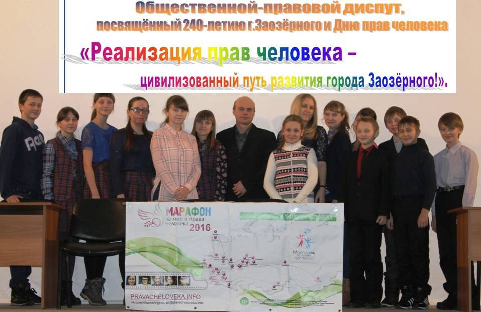 23 декабря в ГДК прошёл общественно-правовой диспут «Реализация прав чловека – цивилизованный путь развития г.Заозёрного», посвящённый Дню прав человека и 240-летию города , в котором приняли участие учащиеся СОШ №1 .